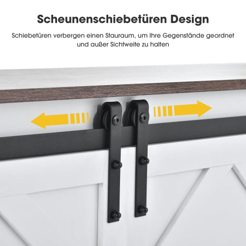 [SCHEUENTÜR-INSPIRIERTER STIL] - Dieser klassische Schiebetürstil spart nicht nur Platz, sondern eignet sich auch für moderne Bauernhäuser und Industrieräume. Dieser TV-Ständer ist eine vielseitige Wahl für Wohn- und Schlafzimmer. Das antike Gleitschienendesign ist nicht nur bequem und praktisch, sondern lässt diesen Scheunentorschrank auch einzigartig aussehen. Dieses Möbelstück vermittelt überall im Haus ein Gefühl von Eleganz und Raffinesse. [PASST BIS ZU 65-ZOLL-FERNSEHGERÄTEN] - Ideal für die meisten Fernseher bis zu 65". Unser TV-Ständer verfügt über eine geräumige Tischplatte, 2 verstellbare Regale unter der Tür, 4 offene Fächer. Sie können Bilderrahmen, CDs, DVDs, Bücher, Zeitschriften usw Zubehör in Ordnung Der großzügige Stauraum macht es einfach, Sammlerstücke oder Dinge des täglichen Bedarfs mit leichtem Zugriff auszustellen. [LANGLEBIGE KONSTRUKTION] - Hergestellt aus hochwertigem Spanplattenmaterial mit guter Tragfähigkeit. Zudem sind Umlenkrollen und Gleitbahn aus hochwertigem Metall gefertigt und haben eine lange Lebensdauer. [DURCHDACHTES DESIGN] - Entworfen mit verstellbaren Ablagefächern, die drei Positionen haben, damit Sie sie nach Ihren Bedürfnissen verschieben können. Darüber hinaus bietet der TV-Schrank mit 2 Kabelführungslöchern einen perfekten Platz für Ihre Medienunterhaltungskomponenten. [EINFACHE MONTAGE]- Werkzeuge und Bedienungsanleitung sind im Paket enthalten. Alle Teile sind eindeutig mit Nummern gekennzeichnet. Befolgen Sie die Anweisungen, Sie können es einfach zusammenbauen.